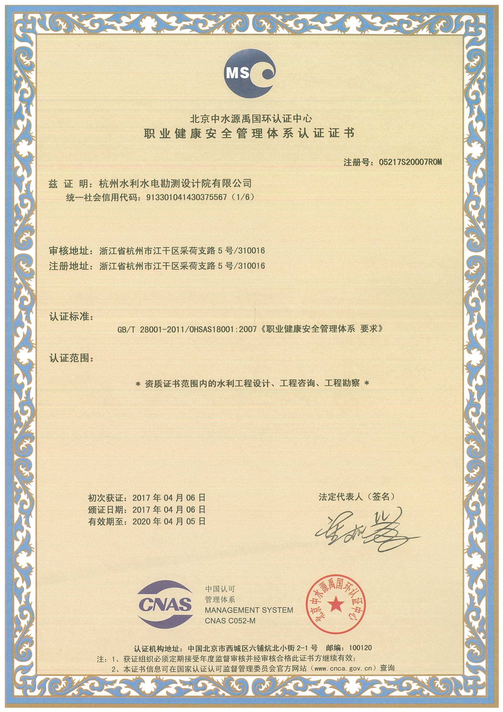 職業健康安全管理體系認證證書