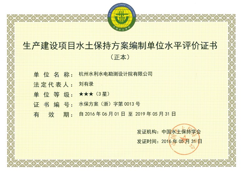 生產建設項目水土保持方案編制單位水平評價3星證書