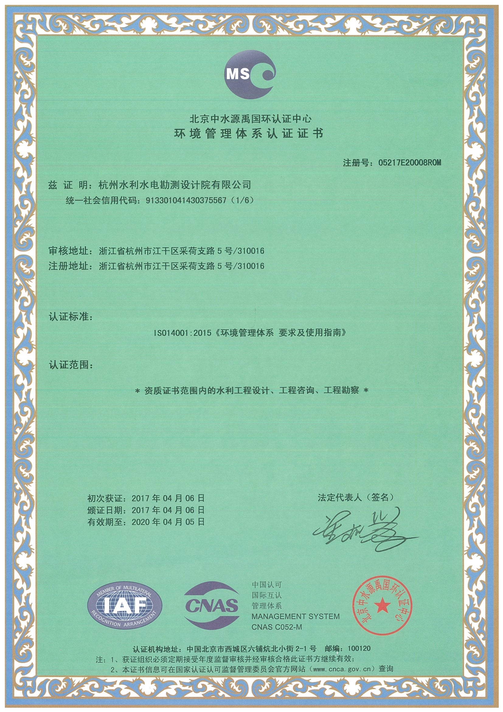 環境管理體系認證證書